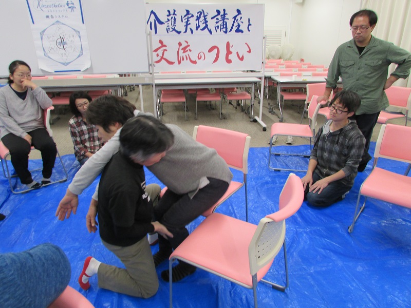 超大型台風接近の雨中でもあり、参加者は17人と前回6月11日の33人より少なくなりましたが、前回に続き小川正子さん(日本キネステティク普及協会ファシリテーター)に講師をしていただき、抱えたり持ち上げたりせずに「対象者が動くのを手伝う」ためのキネステティクという概念を、短時間でしたが実践的に学びました。前回同様、参加者が2人1組となって、お互いの動きを感じ、お互いの動きに合わせて移動・介助するという“共同作業”を体験しました。その後、グループに分かれて感想や仕事での楽しさ、悩みなどを交流する場を持ちました。