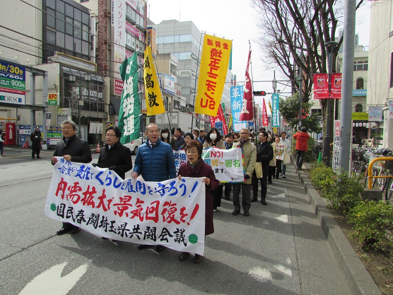2月は埼玉県内での各地域で、21日を中心とした春闘の地域総行動が行われ、労働者の賃上げ、地域経済活性化、中小企業支援強化などで多くの団体を訪問したり、夜の集会・デモ行進が63ヵ所で展開。21日昼は、埼玉春闘共闘・埼労連が県庁前から「賃金引き上げ」「原発再稼働反対」「国は中小企業支援や地域経済活性化支援を」などを訴え、浦和駅までパレードをしました。SU書記長が参加しました。