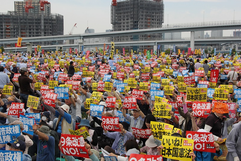 5月3日(木・祝)の憲法記念日、東京・有明防災公園には「安倍改憲NO」「いいね日本国憲法」のプラカードを持った6万人が結集し、憲法集会が開かれました。市民と野党の共闘を推進する立憲野党も参加。この日まで集約を呼びかけていた安倍9条改憲NO!3000万署名は1350万筆が寄せられていることが発表されました。通常国会での提出めざして、引き続き取り組みの強化が呼びかけられました。