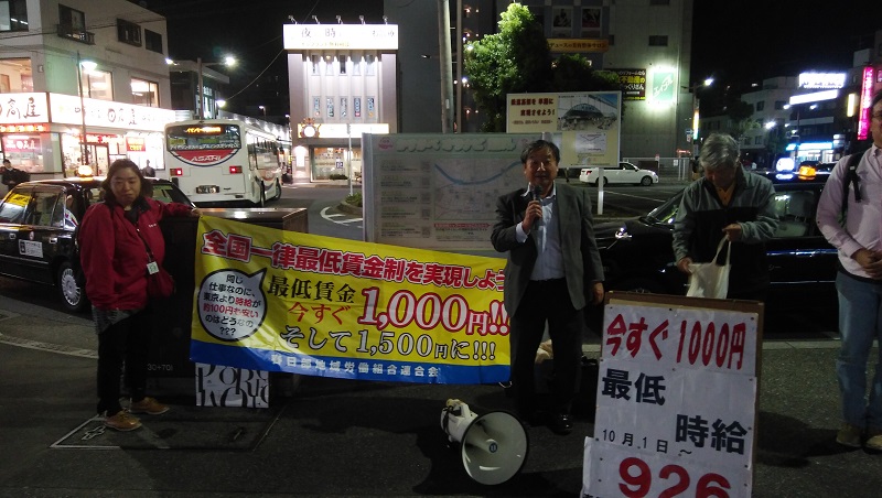 SU春日部支部は10月21日(月)夕方、春日部駅東口で最低賃金が10月から時給926円に改定されたことを周知しながら、「一人でも加入できる全労連・埼玉ユニオンに入りましょう」とSU紹介の宣伝を行いました。9月につづく宣伝で、支部組合員5人と春日部労連役員1人の計6人で、約40分間行いました。