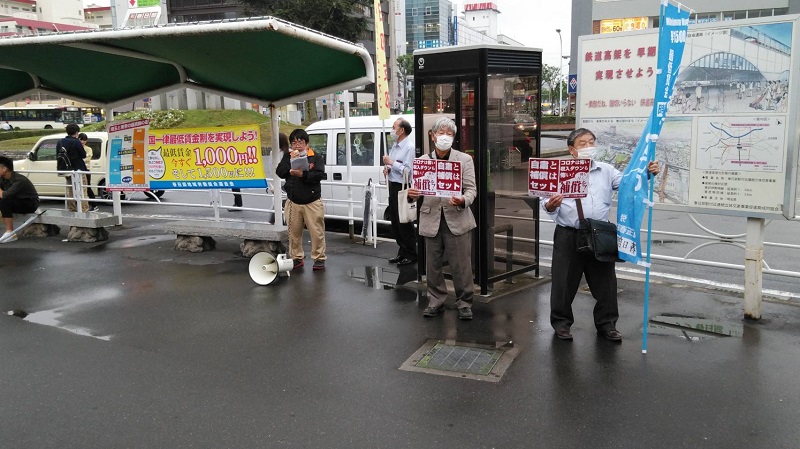 はじめに春日部労連議長が「コロナ禍だからといって、賃下げやひどい働き方が横行するのはとんでもない。こういうときだからこそ最低賃金を上げて誰もが安心して働けるように声をあげましょう」とハンドマイクで訴えがあり、SU支部長が「みなさんのなかで、このコロナ禍の下、解雇や雇い止めにあったり、給料を下げられたりしてませんか?該当する方や心配事がある方はスマホやパソコンで『全労連・埼玉ユニオン』と検索して連絡してください」と訴えました。