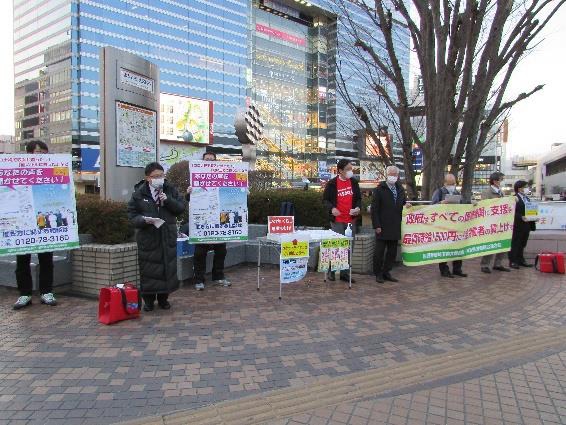 埼労連・埼玉春闘共闘は3月11日午後5時30分から大宮駅西口デッキで春闘宣伝行動を実施し、15団体47人が参加しました。