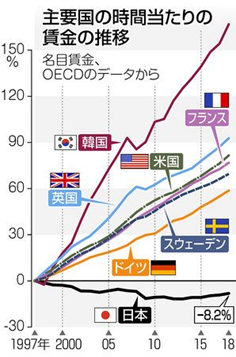 図を見ると、賃金が下がっているのは日本だけです。政権与党は大企業や大金持ちが潤えばその恩恵が労働者に及ぶという「トリクルダウン」政策を進めてきましたが、政府の政策では、労働者の賃上げは実現できないことを「事実」が証明しています。